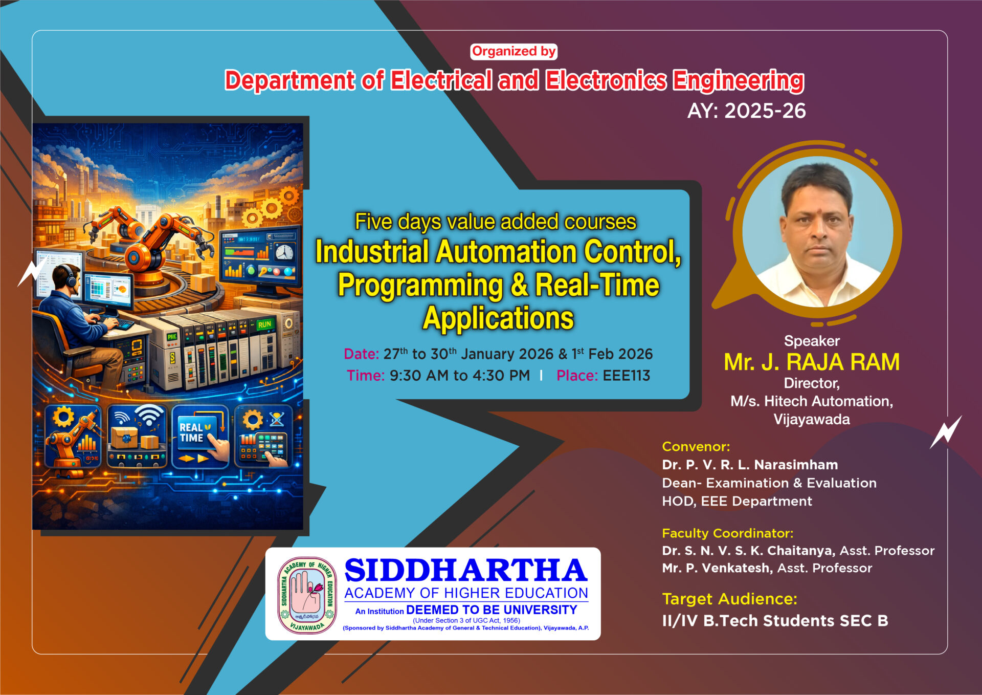 In 2024, VR Siddhartha Engineering College was declared as an institution deemed to be a university under Section 3 of the UGC Act, 1956 by Ministry of Education, Government of India. Furthermore, the name of the university has been changed to “Siddhartha Academy of Higher Education”. With a legacy of educational excellence, the institution’s UGC-granted autonomy, renewed through 2027-28, provides a strong foundation for its transformation.