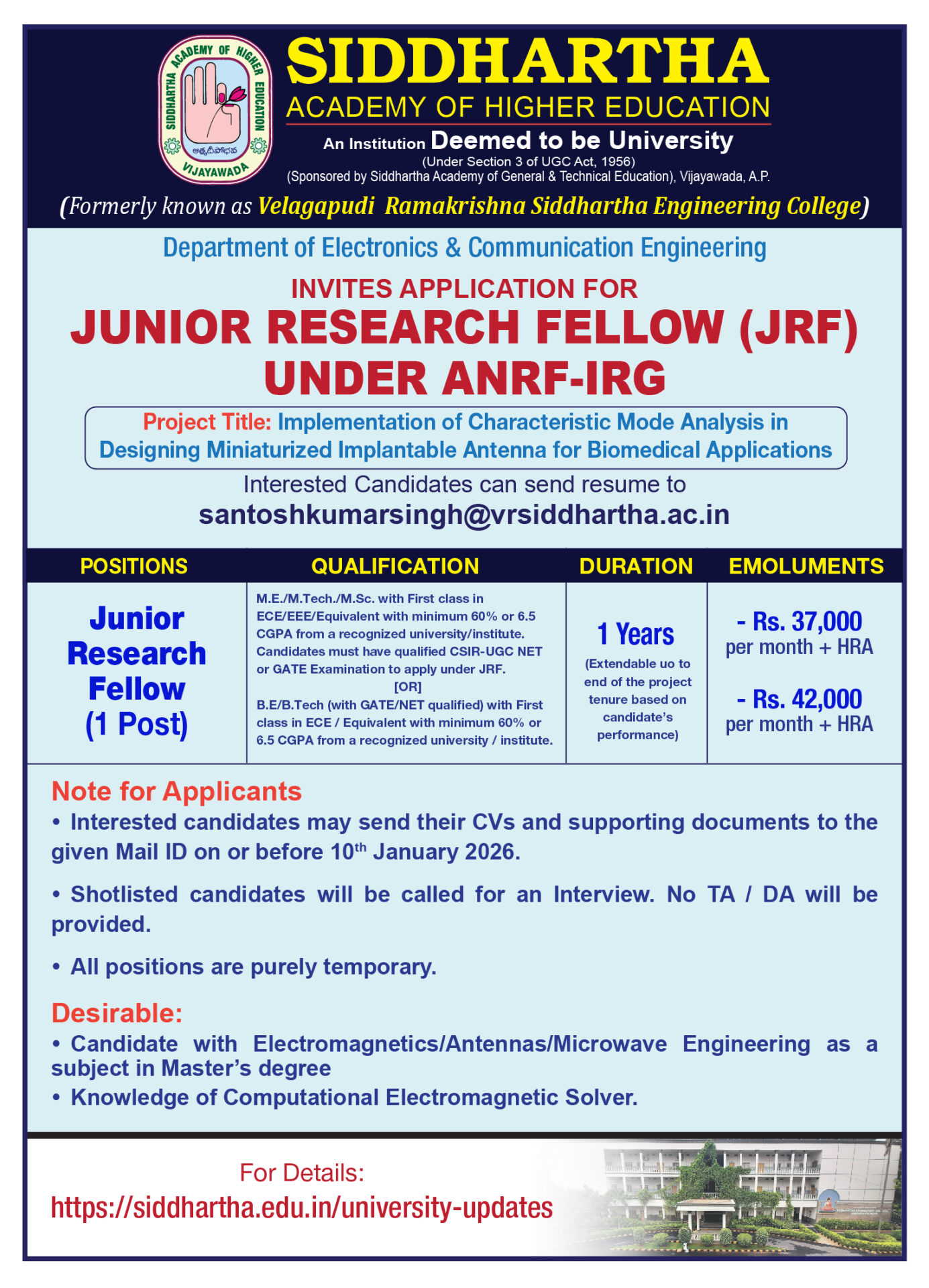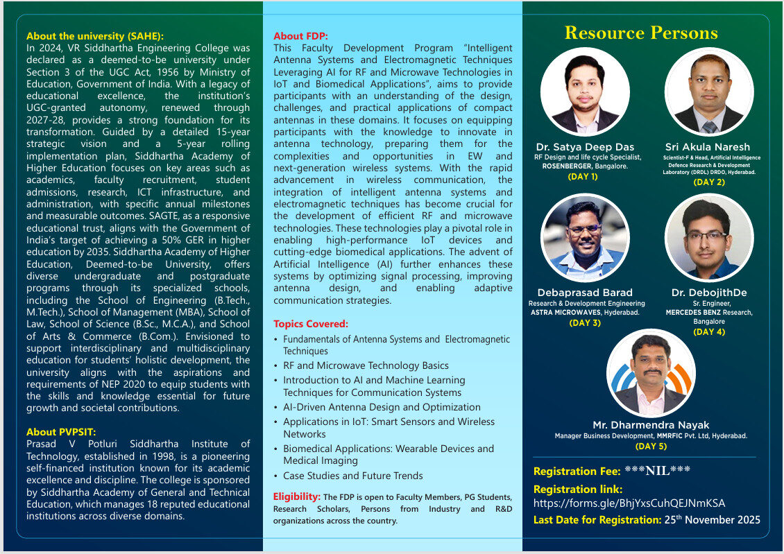 - Conduct of research and guidance in the focused areas of 1. Antennas 2. Image Processing 3. RF & MW 4. VLSI & Embedded Systems.