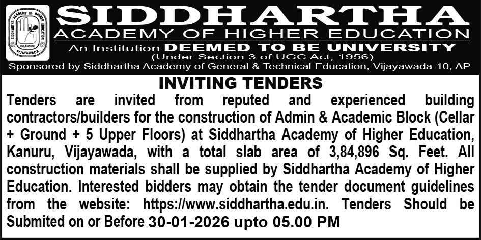 Inviting Tenders: Construction of Admin and Academic Block (C +G+ 6 Upper Floors) in the premises of Siddhartha Academy of Higher Education, Vijayawada.